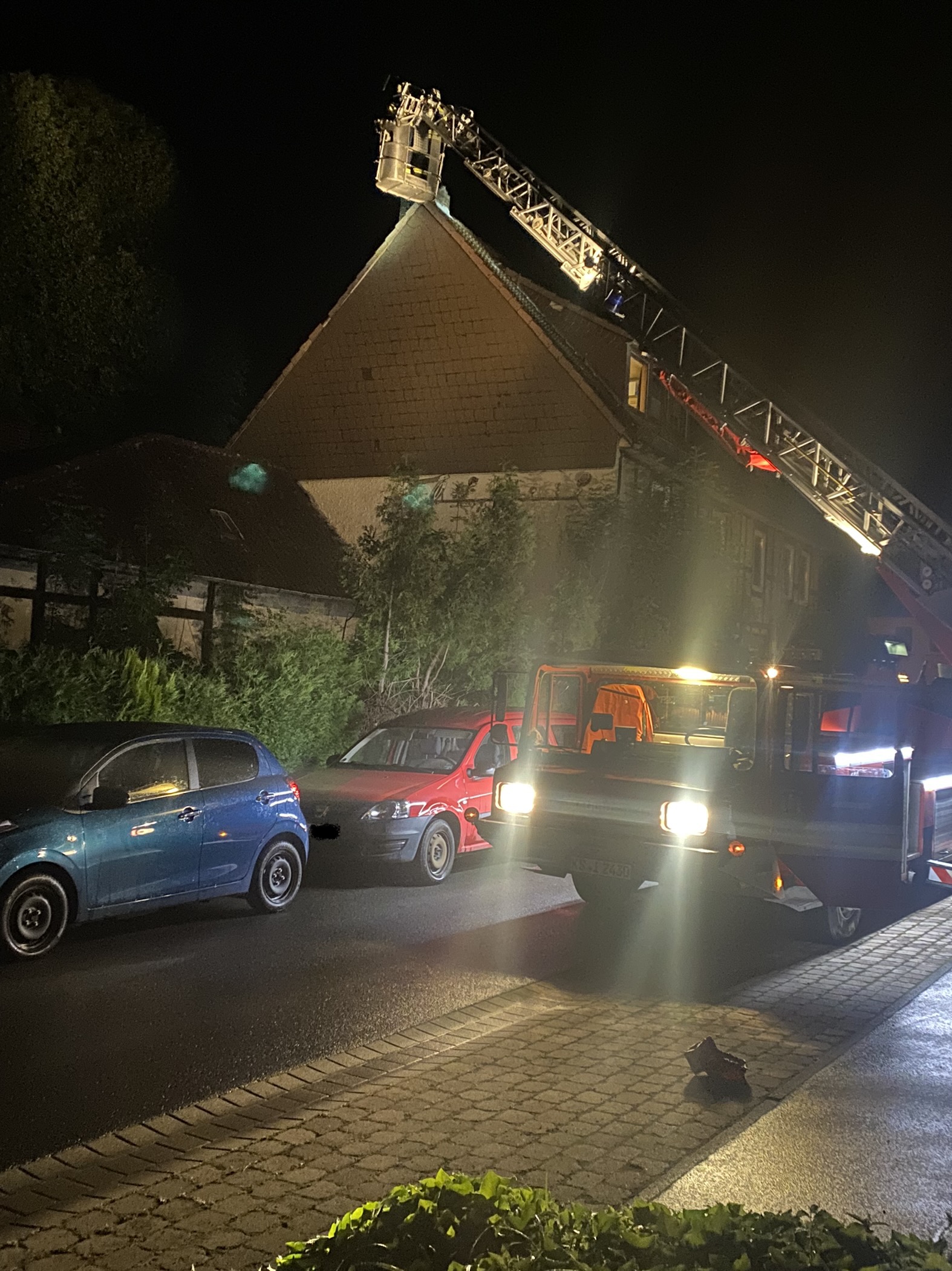 Mit den eigenen Mitteln der Freiwilligen Feuerwehr Holzhausen war die Katze auf dem Dach nicht erreichbar, daher forderten wir die Drehleiter aus Immenhausen nach.