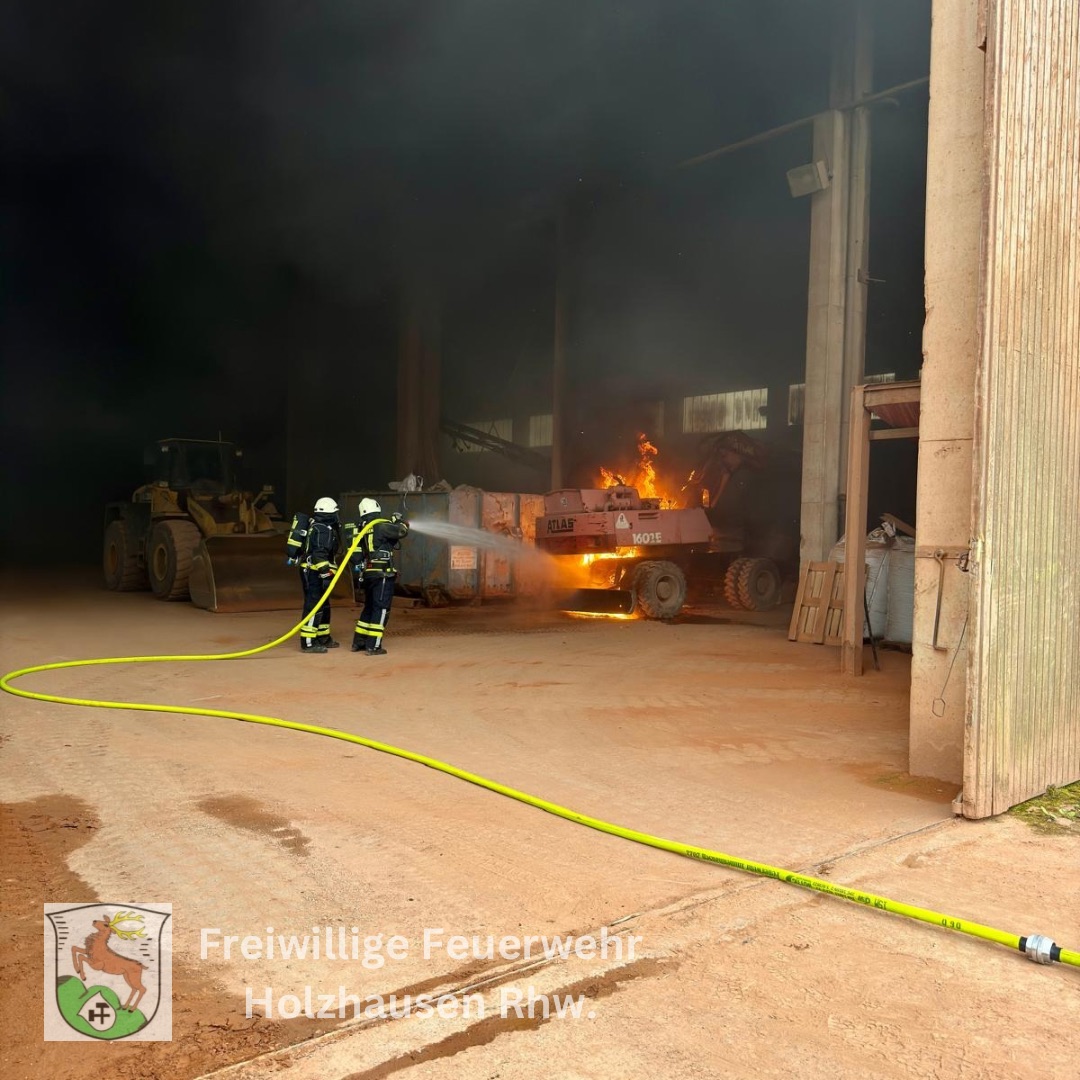 Nachdem die ersten Einsatzkräfte ein Tor der betreffenden Halle aufgebrochen hatten, wurde festgestellt, dass im Inneren des Gebäudes ein Bagger im Vollbrand stand. Außerdem brannte ein in der Nähe des Baggers befindlicher Stapel mit Holzpaletten.