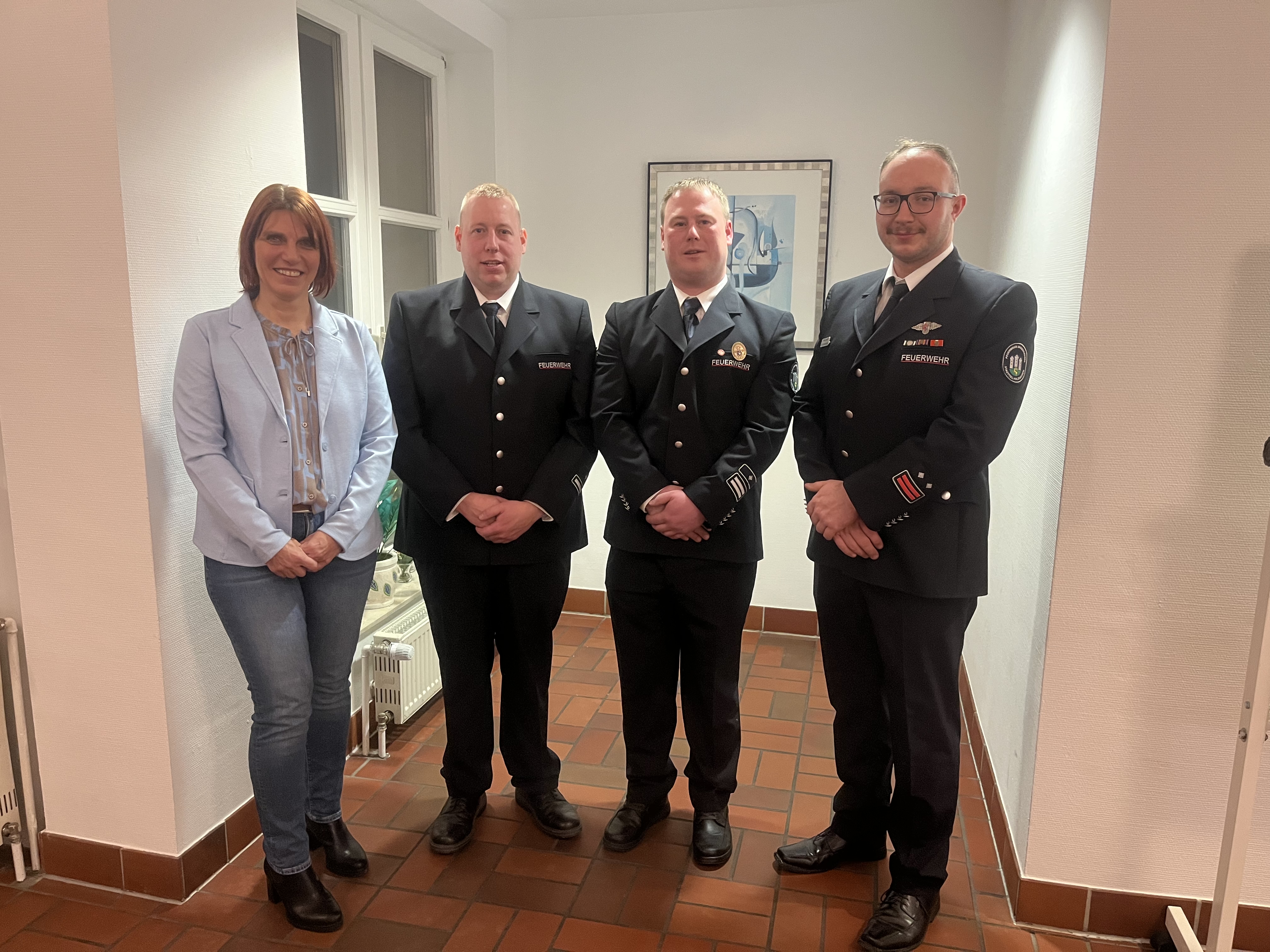 v.l.n.r.: Erste Stadträtin Ute Krug, stellv. Wehrführer Kevin Zschocke, Wehrführer Manuel Tanz und stellv. Stadtbrandinspektor Tobias Grunewald